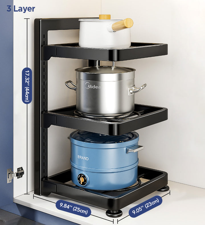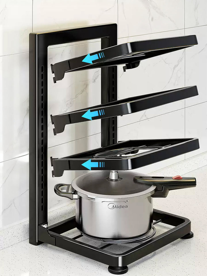 ADJUSTABLE HEIGHT TIERS: The innovative tiered design lets you customize the space between each level. Freely accommodate tall pots, short pans, and everything in between for ultimate versatility.